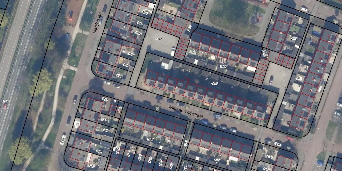 Het perceel waarop Witte de Withstraat 19 staat heeft een oppervlakte van 1732 m². Dit is een zeer groot perceel. De perceeloppervlakte wordt geregistreerd door het Kadaster. Gedetailleerde informatie over de maten van dit perceel kunt u vinden in het rapport Kadastrale kaart met maatvoering van Witte de Withstraat 19.