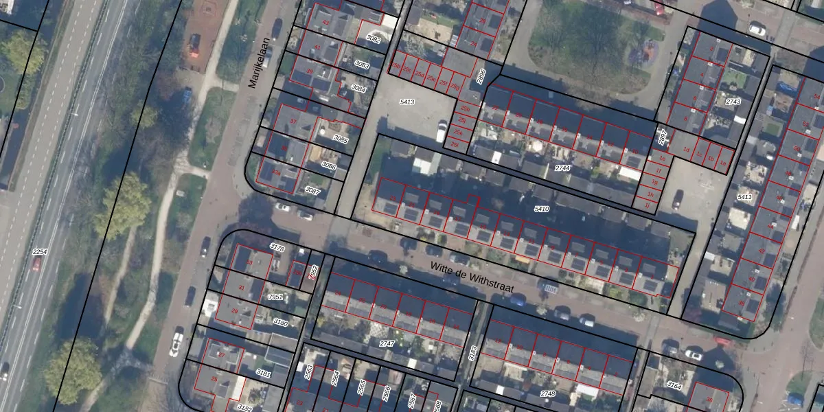 Het perceel waarop Witte de Withstraat 21 staat heeft een oppervlakte van 1732 m². Dit is een zeer groot perceel. De perceeloppervlakte wordt geregistreerd door het Kadaster. Gedetailleerde informatie over de maten van dit perceel kunt u vinden in het rapport Kadastrale kaart met maatvoering van Witte de Withstraat 21.