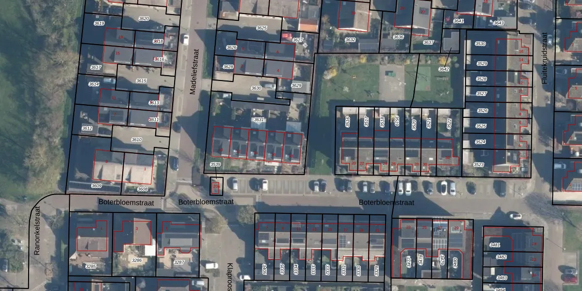 Het perceel waarop Boterbloemstraat 18 staat heeft een oppervlakte van 909 m². Dit is een groot perceel. De perceeloppervlakte wordt geregistreerd door het Kadaster. Gedetailleerde informatie over de maten van dit perceel kunt u vinden in het rapport Kadastrale kaart met maatvoering van Boterbloemstraat 18.