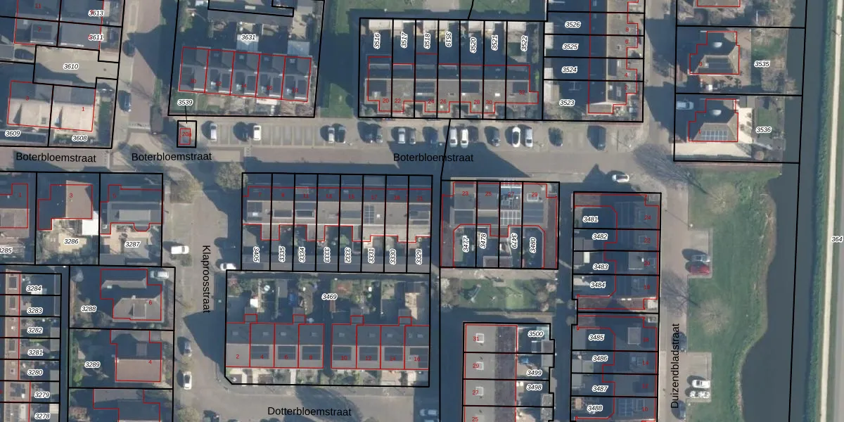 Boterbloemstraat 21 is gelegen op kadastraal perceel BKG00A3329. Deze kadastrale aanduiding is uniek en wordt gebruikt door het Kadaster om eigendomsrechten en andere zakelijke rechten vast te leggen. Het perceel maakt onderdeel uit van de kadastrale gemeente Bleskensgraaf.