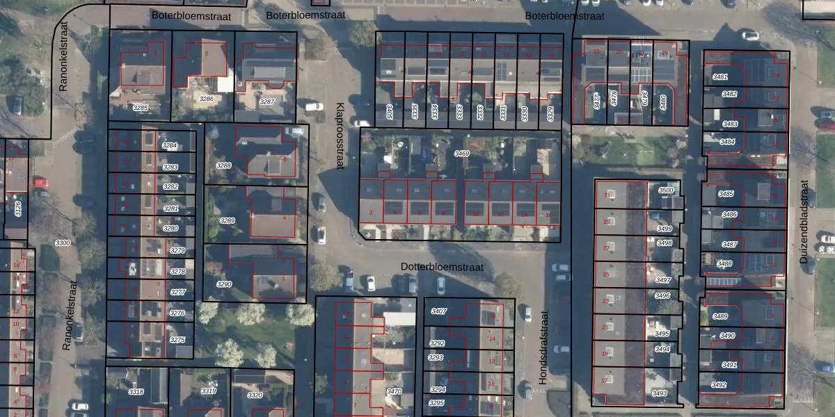 Het perceel waarop Dotterbloemstraat 6 staat heeft een oppervlakte van 1300 m². Dit is een zeer groot perceel. De perceeloppervlakte wordt geregistreerd door het Kadaster. Gedetailleerde informatie over de maten van dit perceel kunt u vinden in het rapport Kadastrale kaart met maatvoering van Dotterbloemstraat 6.