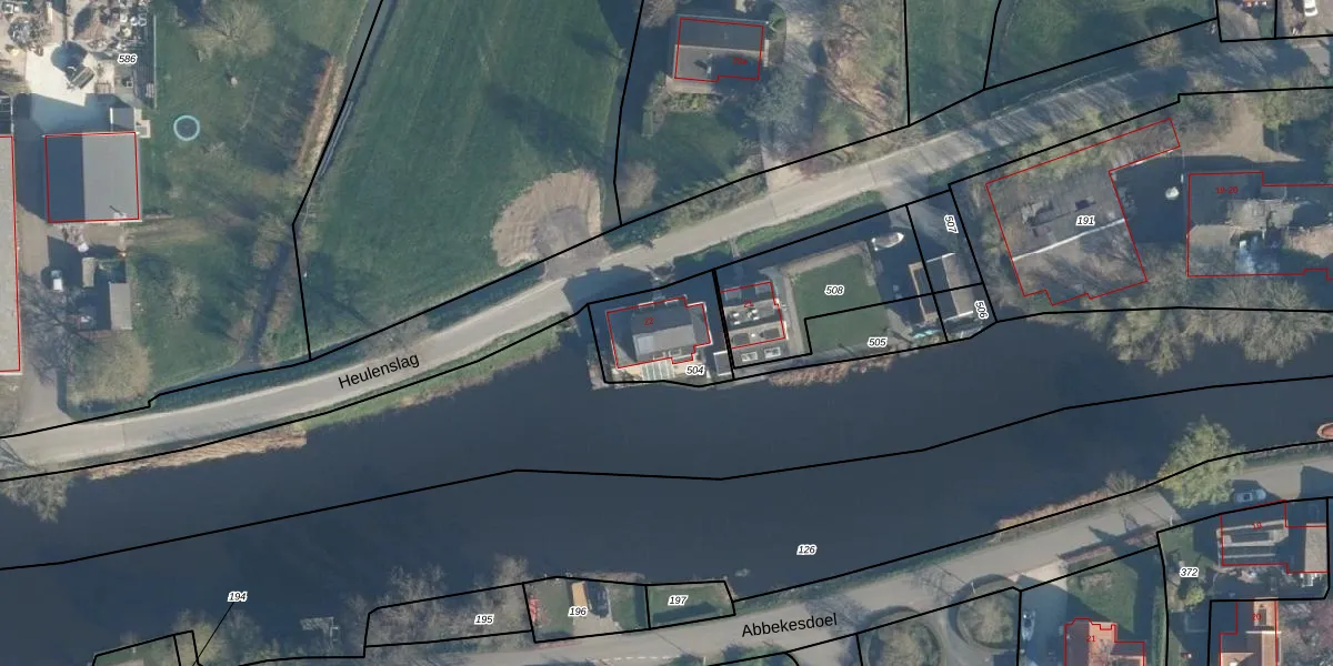 Heulenslag 22 is gelegen op kadastraal perceel BKG00D504. Deze kadastrale aanduiding is uniek en wordt gebruikt door het Kadaster om eigendomsrechten en andere zakelijke rechten vast te leggen. Het perceel maakt onderdeel uit van de kadastrale gemeente Bleskensgraaf.
