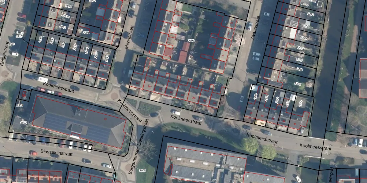 Het perceel waarop Koolmeesstraat 24 staat heeft een oppervlakte van 2819 m². Dit is een zeer groot perceel. De perceeloppervlakte wordt geregistreerd door het Kadaster. Gedetailleerde informatie over de maten van dit perceel kunt u vinden in het rapport Kadastrale kaart met maatvoering van Koolmeesstraat 24.