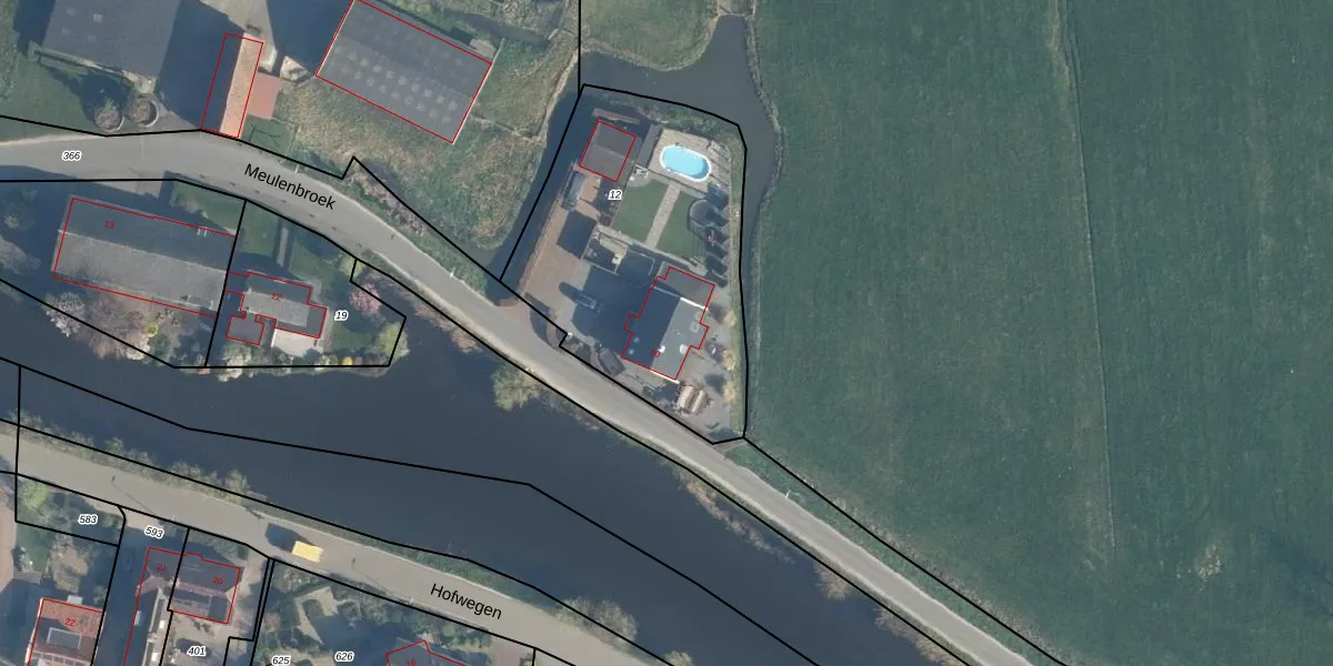 Het perceel waarop Meulenbroek 10 staat heeft een oppervlakte van 1355 m². Dit is een zeer groot perceel. De perceeloppervlakte wordt geregistreerd door het Kadaster. Gedetailleerde informatie over de maten van dit perceel kunt u vinden in het rapport Kadastrale kaart met maatvoering van Meulenbroek 10.