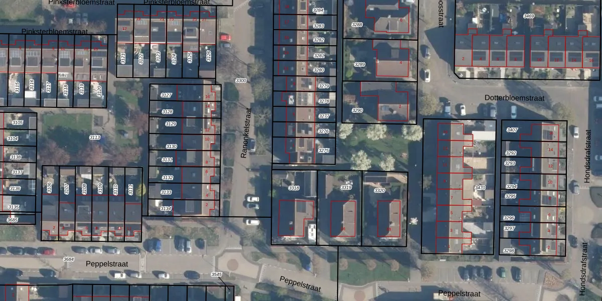 Het perceel waarop Ranonkelstraat 1 staat heeft een oppervlakte van 188 m². Dit is een middelgroot perceel. De perceeloppervlakte wordt geregistreerd door het Kadaster. Gedetailleerde informatie over de maten van dit perceel kunt u vinden in het rapport Kadastrale kaart met maatvoering van Ranonkelstraat 1.