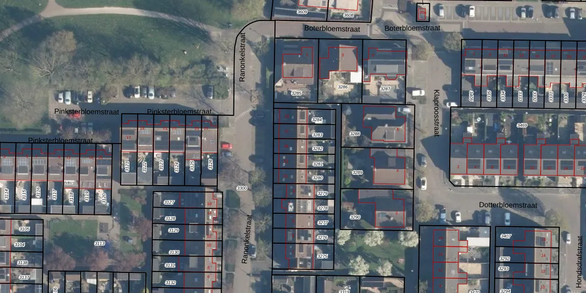 Het perceel waarop Ranonkelstraat 15 staat heeft een oppervlakte van 107 m². Dit is een middelgroot perceel. De perceeloppervlakte wordt geregistreerd door het Kadaster. Gedetailleerde informatie over de maten van dit perceel kunt u vinden in het rapport Kadastrale kaart met maatvoering van Ranonkelstraat 15.