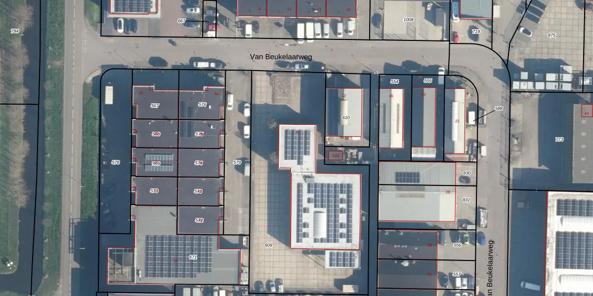Het perceel waarop Van Beukelaarweg 8 staat heeft een oppervlakte van 2550 m². Dit is een zeer groot perceel. De perceeloppervlakte wordt geregistreerd door het Kadaster. Gedetailleerde informatie over de maten van dit perceel kunt u vinden in het rapport Kadastrale kaart met maatvoering van Van Beukelaarweg 8.