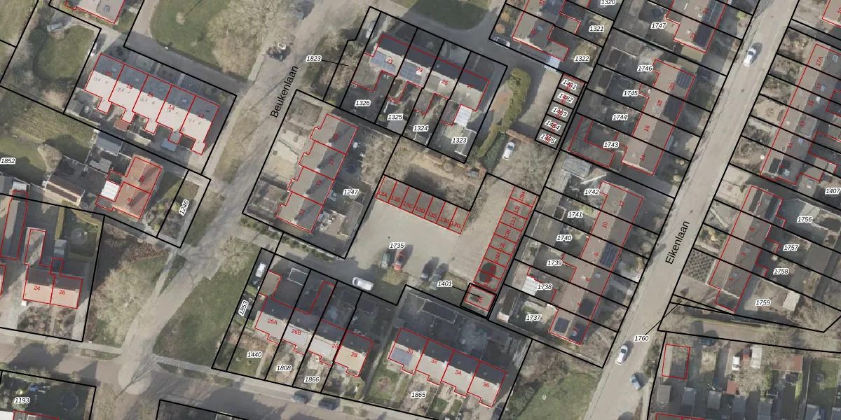 Het perceel waarop Beukenlaan 13-d staat heeft een oppervlakte van 1088 m². Dit is een zeer groot perceel. De perceeloppervlakte wordt geregistreerd door het Kadaster. Gedetailleerde informatie over de maten van dit perceel kunt u vinden in het rapport Kadastrale kaart met maatvoering van Beukenlaan 13-d.