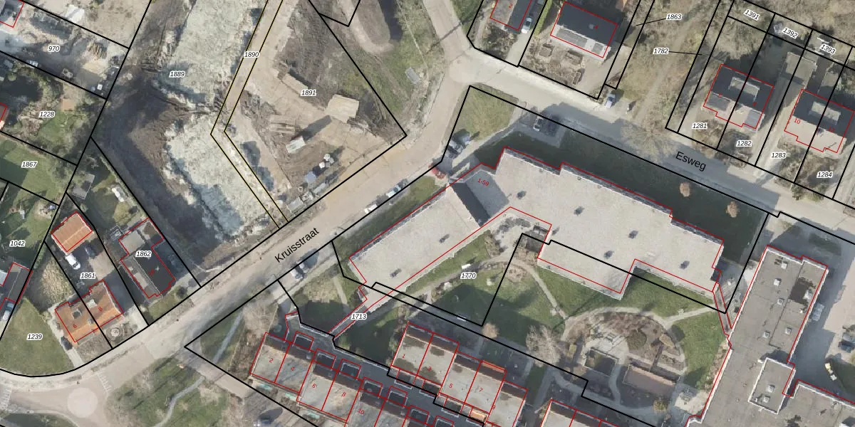 Het perceel waarop Esweg 25 staat heeft een oppervlakte van 2855 m². Dit is een zeer groot perceel. De perceeloppervlakte wordt geregistreerd door het Kadaster. Gedetailleerde informatie over de maten van dit perceel kunt u vinden in het rapport Kadastrale kaart met maatvoering van Esweg 25.