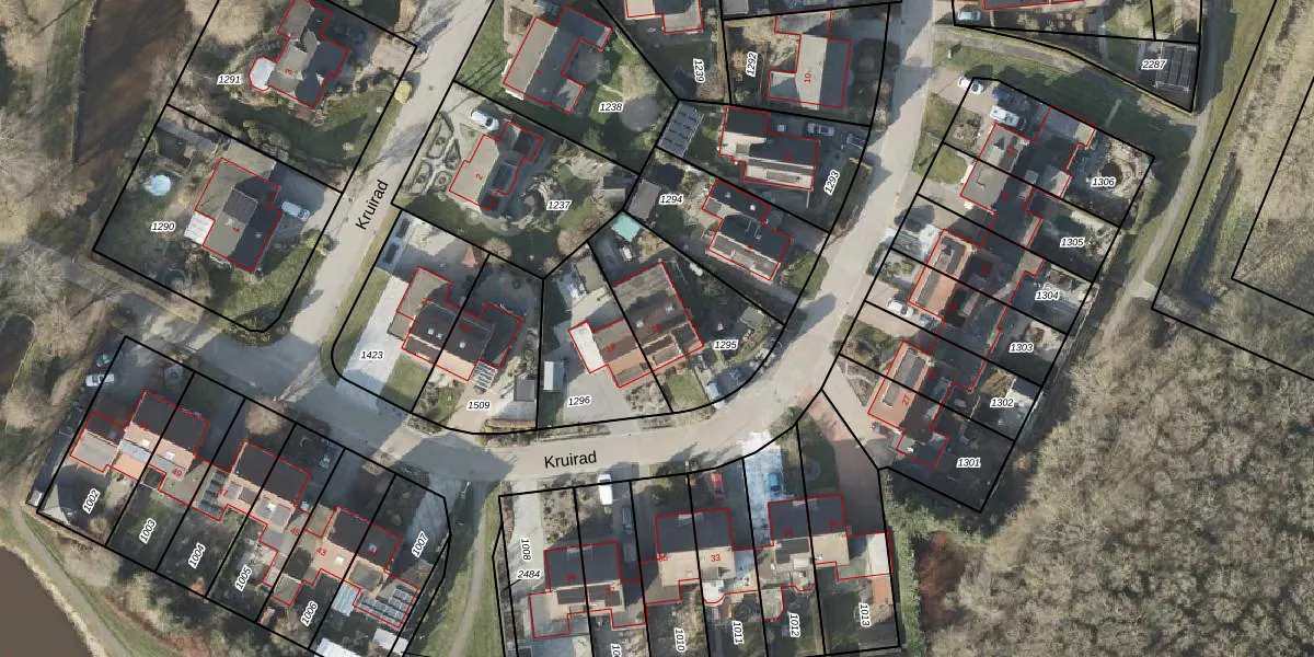 Het perceel waarop Kruirad 16 staat heeft een oppervlakte van 461 m². Dit is een groot perceel. De perceeloppervlakte wordt geregistreerd door het Kadaster. Gedetailleerde informatie over de maten van dit perceel kunt u vinden in het rapport Kadastrale kaart met maatvoering van Kruirad 16.