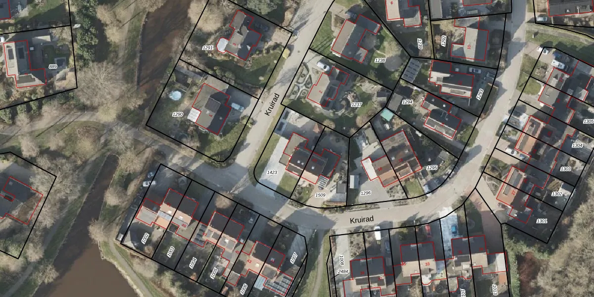 Het perceel waarop Kruirad 22 staat heeft een oppervlakte van 405 m². Dit is een groot perceel. De perceeloppervlakte wordt geregistreerd door het Kadaster. Gedetailleerde informatie over de maten van dit perceel kunt u vinden in het rapport Kadastrale kaart met maatvoering van Kruirad 22.