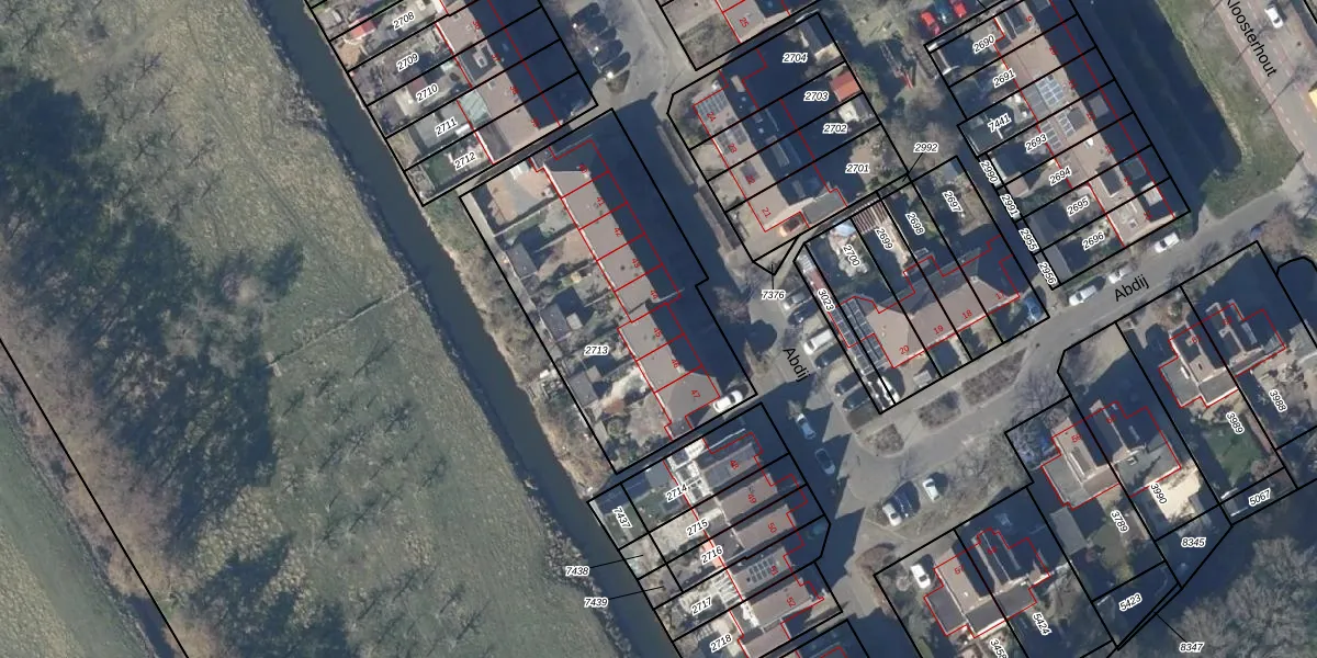 Het perceel waarop Abdij 45 staat heeft een oppervlakte van 1256 m². Dit is een zeer groot perceel. De perceeloppervlakte wordt geregistreerd door het Kadaster. Gedetailleerde informatie over de maten van dit perceel kunt u vinden in het rapport Kadastrale kaart met maatvoering van Abdij 45.