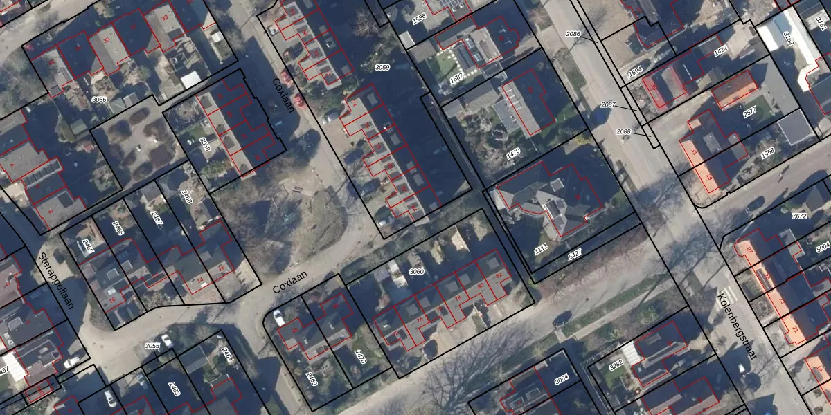 Het perceel waarop Coxlaan 84 staat heeft een oppervlakte van 1595 m². Dit is een zeer groot perceel. De perceeloppervlakte wordt geregistreerd door het Kadaster. Gedetailleerde informatie over de maten van dit perceel kunt u vinden in het rapport Kadastrale kaart met maatvoering van Coxlaan 84.