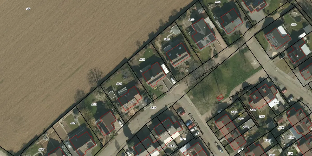Het perceel waarop Bethlehemstraat 9 staat heeft een oppervlakte van 614 m². Dit is een groot perceel. De perceeloppervlakte wordt geregistreerd door het Kadaster. Gedetailleerde informatie over de maten van dit perceel kunt u vinden in het rapport Kadastrale kaart met maatvoering van Bethlehemstraat 9.
