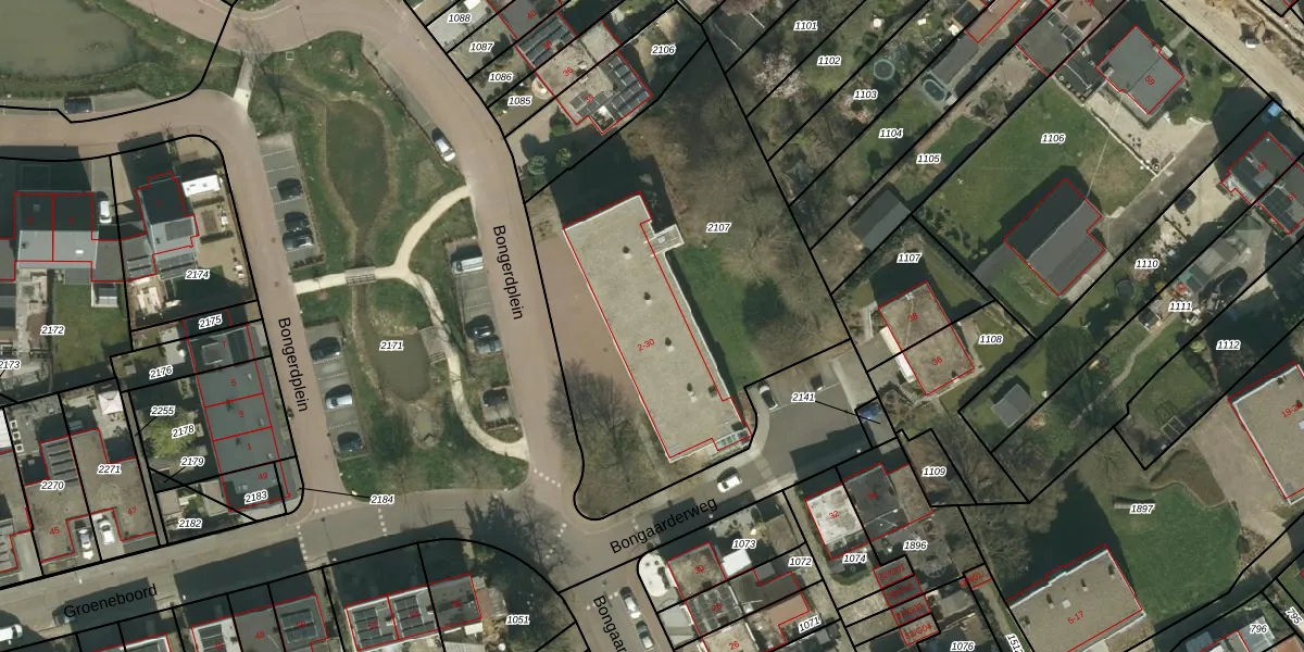 Het perceel waarop Bongerdplein 8-G07 staat heeft een oppervlakte van 2038 m². Dit is een zeer groot perceel. De perceeloppervlakte wordt geregistreerd door het Kadaster. Gedetailleerde informatie over de maten van dit perceel kunt u vinden in het rapport Kadastrale kaart met maatvoering van Bongerdplein 8-G07.