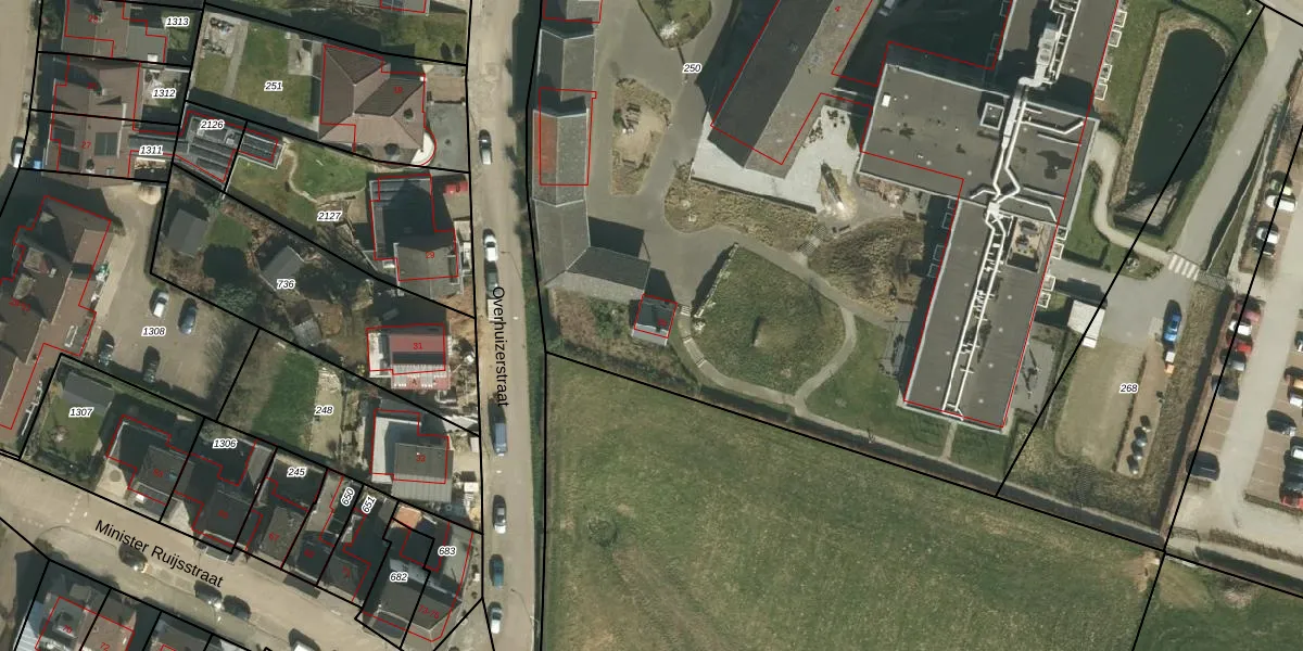 Overhuizerstraat 2-b is gelegen op kadastraal perceel SPV00N250. Deze kadastrale aanduiding is uniek en wordt gebruikt door het Kadaster om eigendomsrechten en andere zakelijke rechten vast te leggen. Het perceel maakt onderdeel uit van de kadastrale gemeente Simpelveld.