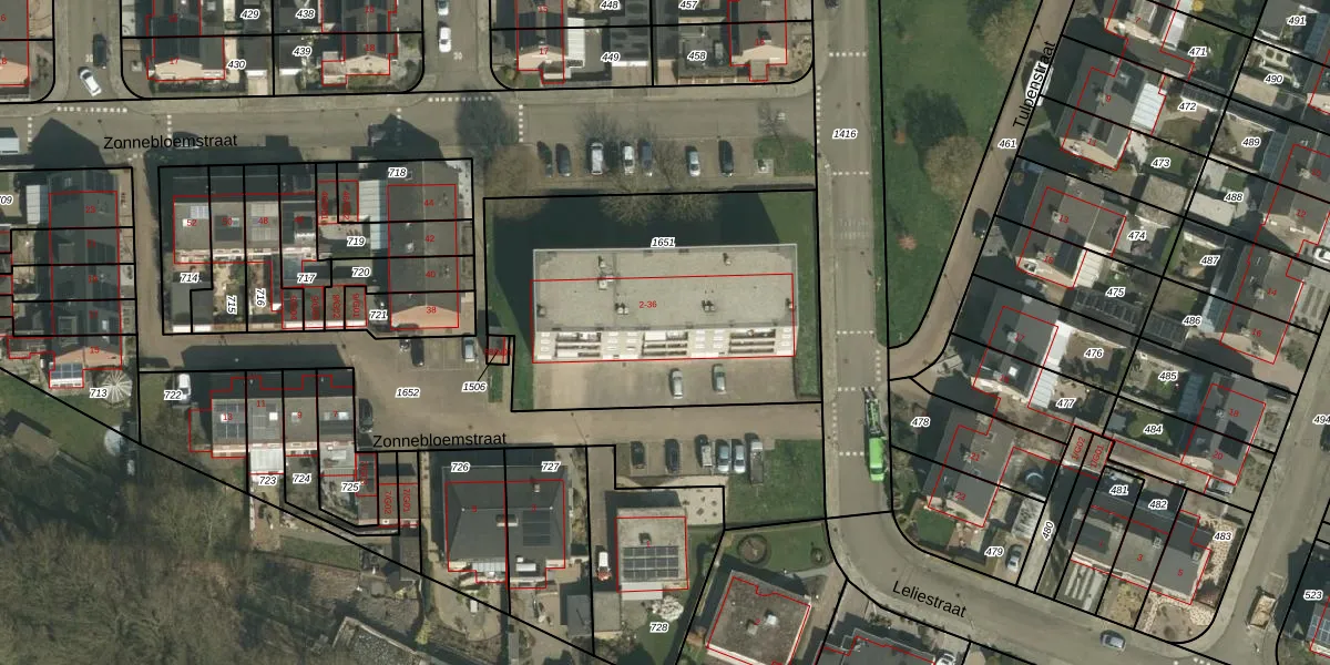 Zonnebloemstraat 14 is gelegen op kadastraal perceel SPV00G1651. Deze kadastrale aanduiding is uniek en wordt gebruikt door het Kadaster om eigendomsrechten en andere zakelijke rechten vast te leggen. Het perceel maakt onderdeel uit van de kadastrale gemeente Simpelveld.