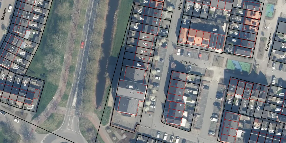 Het perceel waarop het adres ligt is BDG00-H-732. De afkorting 'BDG00' staat voor kadastrale gemeente Bodegraven. Het perceel is kleiner dan gemiddeld in Bodegraven. Het perceel is 869 m² groot, terwijl het gemiddelde ligt op 3221,51 m². Het kleinste perceel in de kadastrale gemeente is 0 m² groot. De grootste perceeloppervlakte is 36,3 ha. Er zijn 23 adressen aanwezig op het perceel. De huidige grenzen van het perceel zijn digitaal in de Basisregistratie Kadaster (BRK) geregistreerd op 05-04-2012.