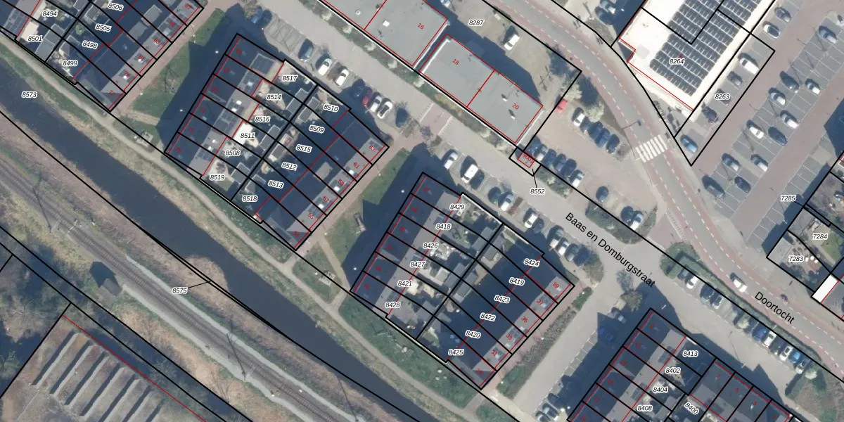 Baas en Domburgstraat 43 is gelegen op kadastraal perceel BDG00C8418. Deze kadastrale aanduiding is uniek en wordt gebruikt door het Kadaster om eigendomsrechten en andere zakelijke rechten vast te leggen. Het perceel maakt onderdeel uit van de kadastrale gemeente Bodegraven.
