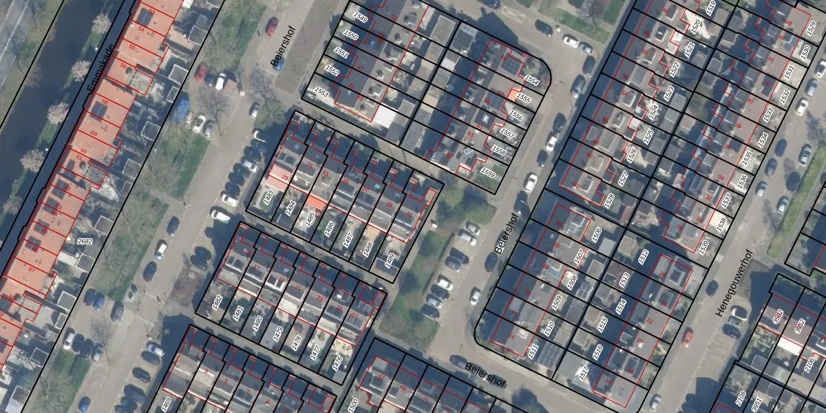 Het perceel waarop Beiershof 41 staat heeft een oppervlakte van 185 m². Dit is een middelgroot perceel. De perceeloppervlakte wordt geregistreerd door het Kadaster. Gedetailleerde informatie over de maten van dit perceel kunt u vinden in het rapport Kadastrale kaart met maatvoering van Beiershof 41.