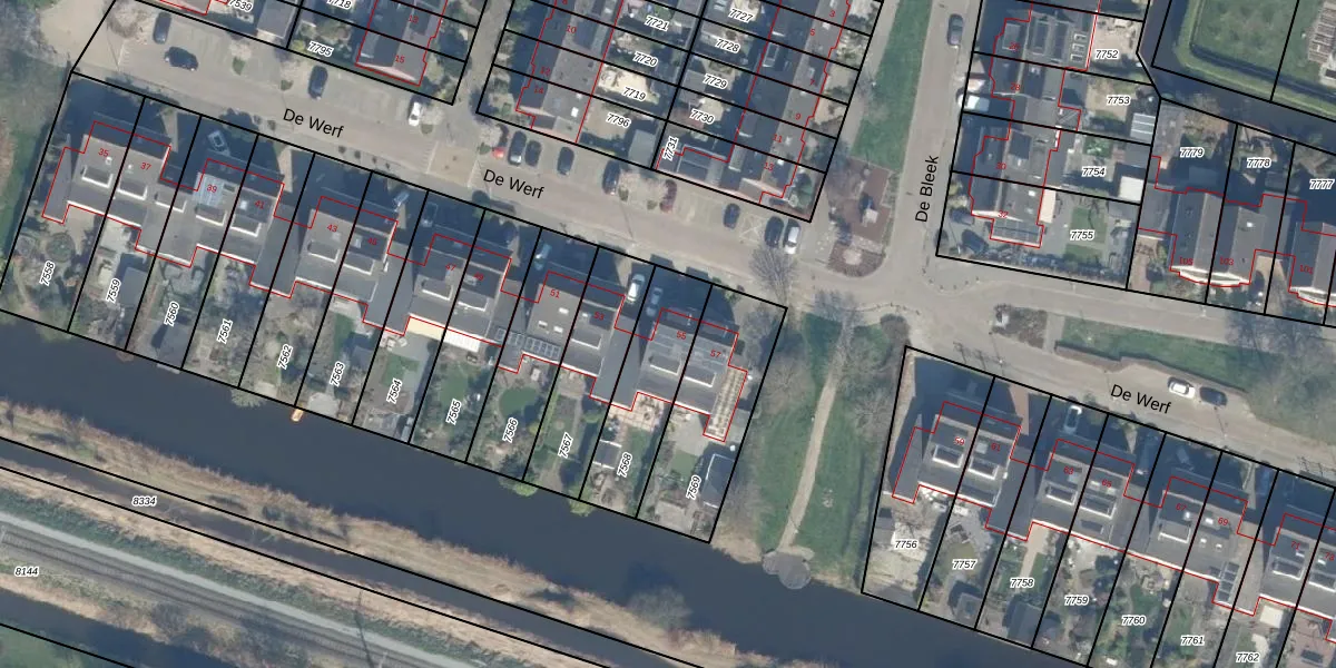 Het perceel waarop De Werf 55 staat heeft een oppervlakte van 332 m². Dit is een groot perceel. De perceeloppervlakte wordt geregistreerd door het Kadaster. Gedetailleerde informatie over de maten van dit perceel kunt u vinden in het rapport Kadastrale kaart met maatvoering van De Werf 55.