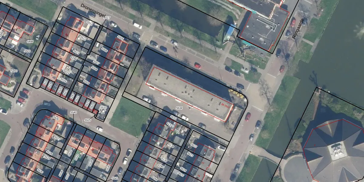 Het perceel waarop Dronensingel 55 staat heeft een oppervlakte van 1710 m². Dit is een zeer groot perceel. De perceeloppervlakte wordt geregistreerd door het Kadaster. Gedetailleerde informatie over de maten van dit perceel kunt u vinden in het rapport Kadastrale kaart met maatvoering van Dronensingel 55.