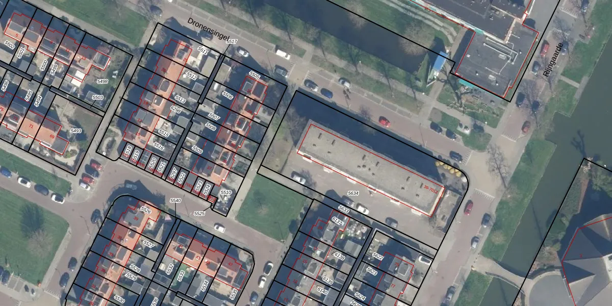 Het perceel waarop Dronensingel 63 staat heeft een oppervlakte van 1710 m². Dit is een zeer groot perceel. De perceeloppervlakte wordt geregistreerd door het Kadaster. Gedetailleerde informatie over de maten van dit perceel kunt u vinden in het rapport Kadastrale kaart met maatvoering van Dronensingel 63.