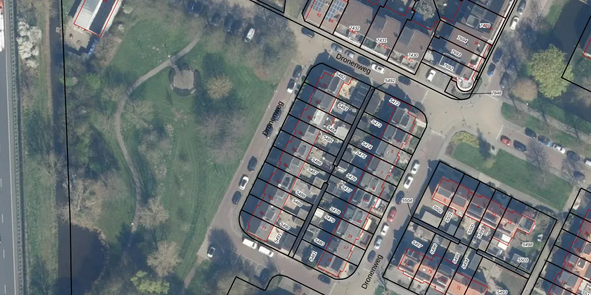 Dronenweg 31 is gelegen op kadastraal perceel BDG00C5486. Deze kadastrale aanduiding is uniek en wordt gebruikt door het Kadaster om eigendomsrechten en andere zakelijke rechten vast te leggen. Het perceel maakt onderdeel uit van de kadastrale gemeente Bodegraven.