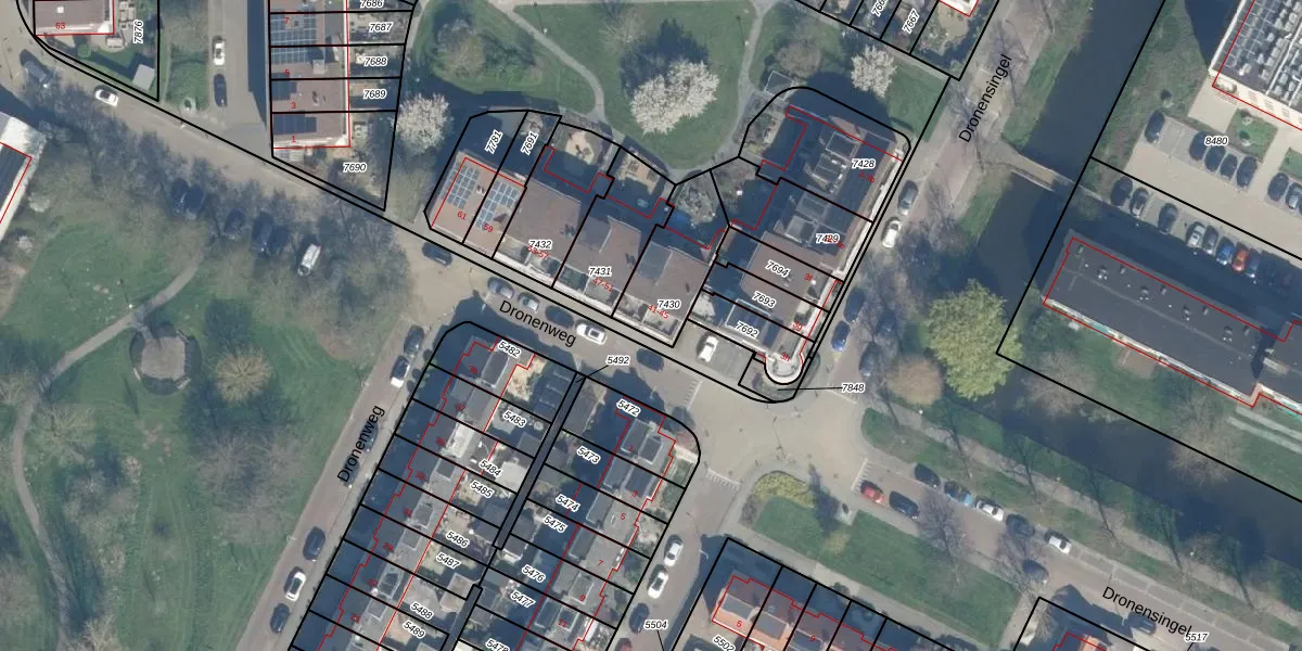 Dronenweg 45 is gelegen op kadastraal perceel BDG00C7430. Deze kadastrale aanduiding is uniek en wordt gebruikt door het Kadaster om eigendomsrechten en andere zakelijke rechten vast te leggen. Het perceel maakt onderdeel uit van de kadastrale gemeente Bodegraven.