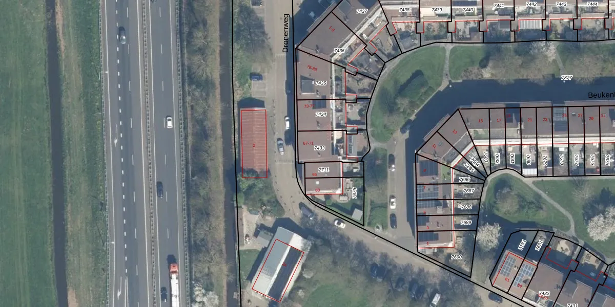 Dronenweg 71 is gelegen op kadastraal perceel BDG00C7433. Deze kadastrale aanduiding is uniek en wordt gebruikt door het Kadaster om eigendomsrechten en andere zakelijke rechten vast te leggen. Het perceel maakt onderdeel uit van de kadastrale gemeente Bodegraven.