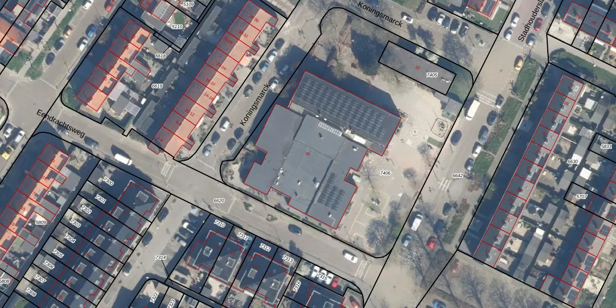 Eendrachtsweg 30 is gelegen op kadastraal perceel BDG00B7406. Deze kadastrale aanduiding is uniek en wordt gebruikt door het Kadaster om eigendomsrechten en andere zakelijke rechten vast te leggen. Het perceel maakt onderdeel uit van de kadastrale gemeente Bodegraven.