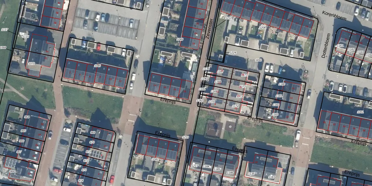 Het perceel waarop Ereprijs 20 staat heeft een oppervlakte van 1665 m². Dit is een zeer groot perceel. De perceeloppervlakte wordt geregistreerd door het Kadaster. Gedetailleerde informatie over de maten van dit perceel kunt u vinden in het rapport Kadastrale kaart met maatvoering van Ereprijs 20.