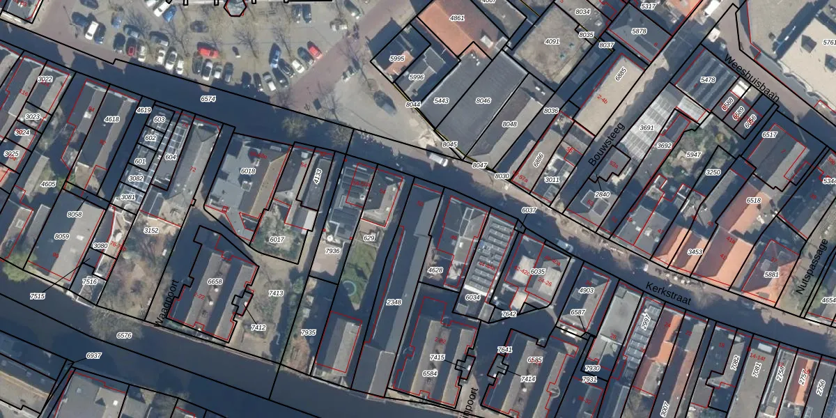 Kerkstraat 50 is gelegen op kadastraal perceel BDG00B2348. Deze kadastrale aanduiding is uniek en wordt gebruikt door het Kadaster om eigendomsrechten en andere zakelijke rechten vast te leggen. Het perceel maakt onderdeel uit van de kadastrale gemeente Bodegraven.