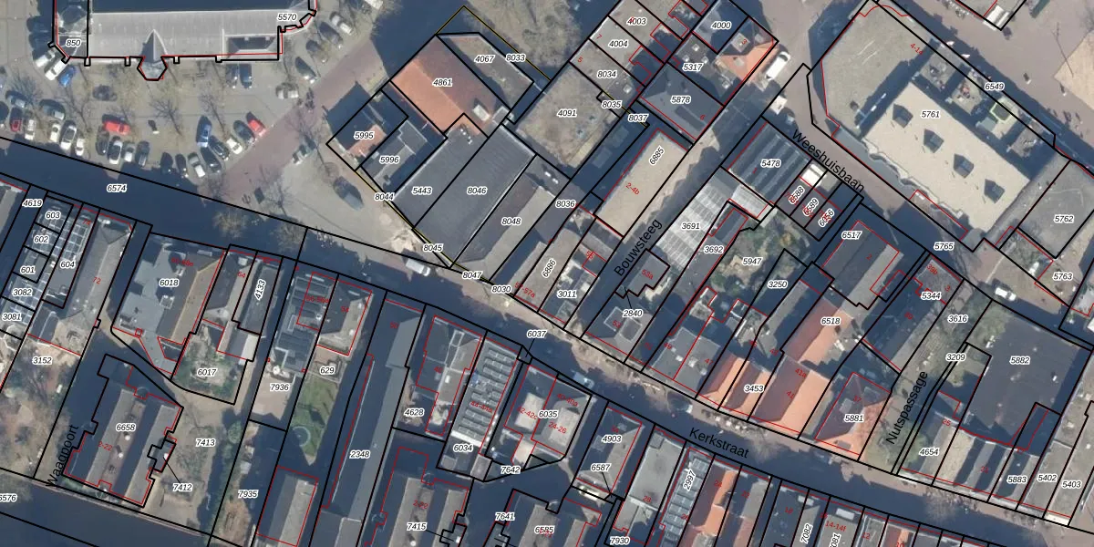 Kerkstraat 57-b is gelegen op kadastraal perceel BDG00B6886. Deze kadastrale aanduiding is uniek en wordt gebruikt door het Kadaster om eigendomsrechten en andere zakelijke rechten vast te leggen. Het perceel maakt onderdeel uit van de kadastrale gemeente Bodegraven.