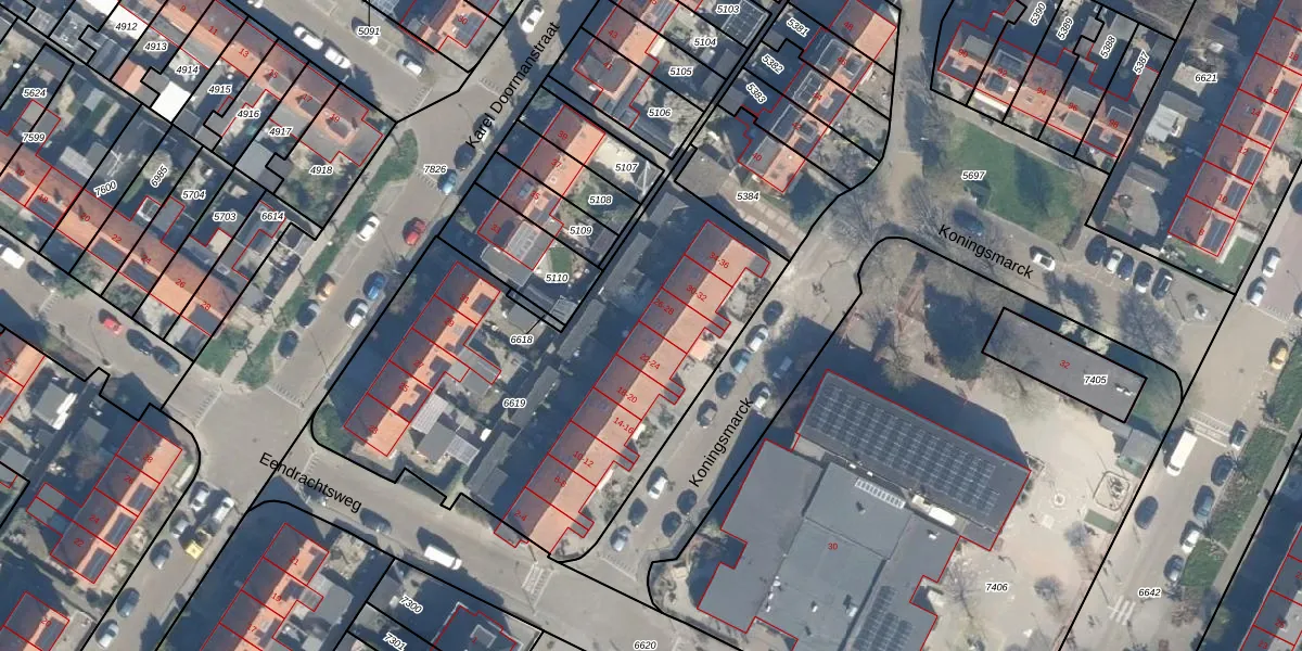 Het perceel waarop Koningsmarck 26 staat heeft een oppervlakte van 2160 m². Dit is een zeer groot perceel. De perceeloppervlakte wordt geregistreerd door het Kadaster. Gedetailleerde informatie over de maten van dit perceel kunt u vinden in het rapport Kadastrale kaart met maatvoering van Koningsmarck 26.