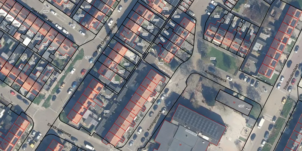 Het perceel waarop Koningsmarck 36 staat heeft een oppervlakte van 2160 m². Dit is een zeer groot perceel. De perceeloppervlakte wordt geregistreerd door het Kadaster. Gedetailleerde informatie over de maten van dit perceel kunt u vinden in het rapport Kadastrale kaart met maatvoering van Koningsmarck 36.