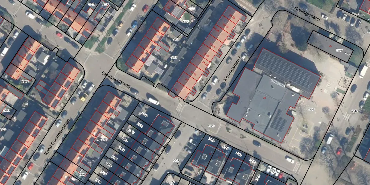Het perceel waarop Koningsmarck 4 staat heeft een oppervlakte van 2160 m². Dit is een zeer groot perceel. De perceeloppervlakte wordt geregistreerd door het Kadaster. Gedetailleerde informatie over de maten van dit perceel kunt u vinden in het rapport Kadastrale kaart met maatvoering van Koningsmarck 4.