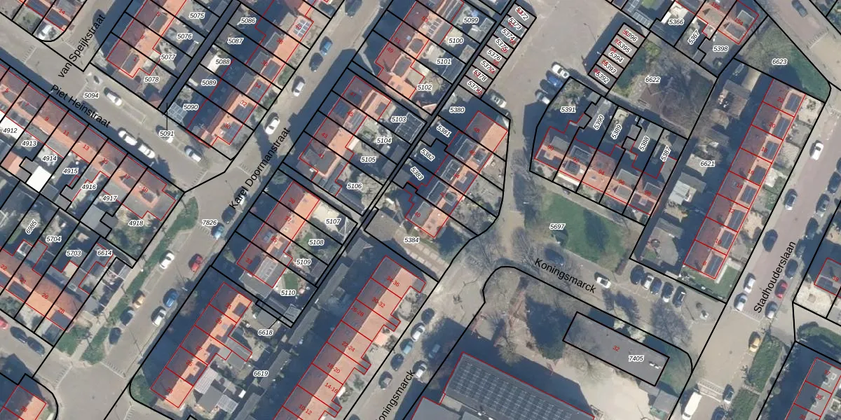 Het perceel waarop Koningsmarck 40 staat heeft een oppervlakte van 335 m². Dit is een groot perceel. De perceeloppervlakte wordt geregistreerd door het Kadaster. Gedetailleerde informatie over de maten van dit perceel kunt u vinden in het rapport Kadastrale kaart met maatvoering van Koningsmarck 40.