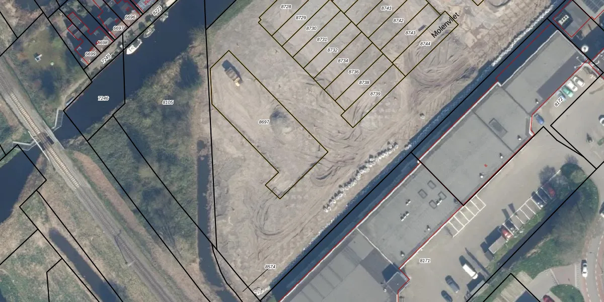 Het perceel waarop Molenvliet 54 staat heeft een oppervlakte van 771 m². Dit is een groot perceel. De perceeloppervlakte wordt geregistreerd door het Kadaster. Gedetailleerde informatie over de maten van dit perceel kunt u vinden in het rapport Kadastrale kaart met maatvoering van Molenvliet 54.