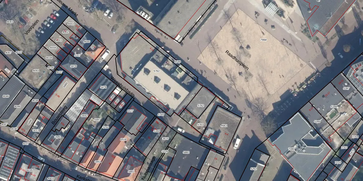 Het perceel waarop Raadhuisplein 4 staat heeft een oppervlakte van 1127 m². Dit is een zeer groot perceel. De perceeloppervlakte wordt geregistreerd door het Kadaster. Gedetailleerde informatie over de maten van dit perceel kunt u vinden in het rapport Kadastrale kaart met maatvoering van Raadhuisplein 4.