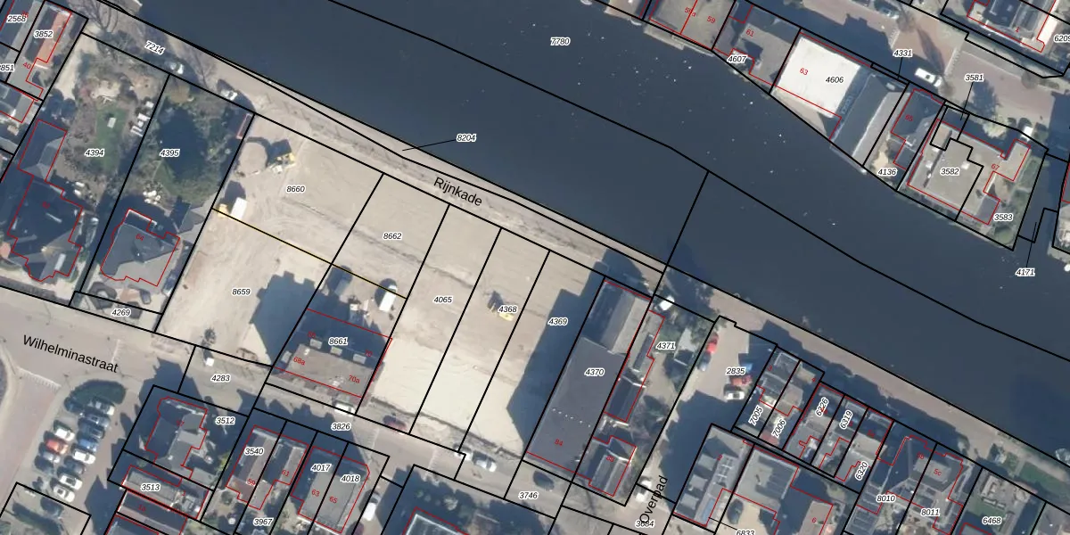 Het perceel waarop Rijnkade 66 staat heeft een oppervlakte van 408 m². Dit is een groot perceel. De perceeloppervlakte wordt geregistreerd door het Kadaster. Gedetailleerde informatie over de maten van dit perceel kunt u vinden in het rapport Kadastrale kaart met maatvoering van Rijnkade 66.