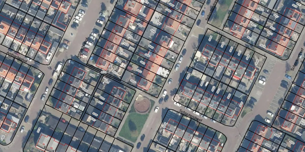Schoutendreef 14 is gelegen op kadastraal perceel BDG00C5452. Deze kadastrale aanduiding is uniek en wordt gebruikt door het Kadaster om eigendomsrechten en andere zakelijke rechten vast te leggen. Het perceel maakt onderdeel uit van de kadastrale gemeente Bodegraven.