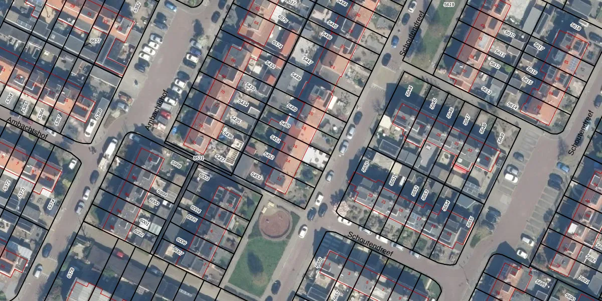 Schoutendreef 16 is gelegen op kadastraal perceel BDG00C5451. Deze kadastrale aanduiding is uniek en wordt gebruikt door het Kadaster om eigendomsrechten en andere zakelijke rechten vast te leggen. Het perceel maakt onderdeel uit van de kadastrale gemeente Bodegraven.