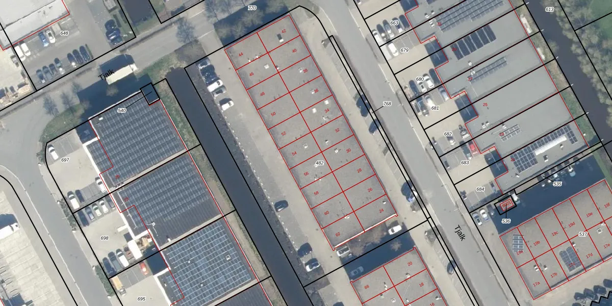 Het perceel waarop Tjalk 54 staat heeft een oppervlakte van 3761 m². Dit is een zeer groot perceel. De perceeloppervlakte wordt geregistreerd door het Kadaster. Gedetailleerde informatie over de maten van dit perceel kunt u vinden in het rapport Kadastrale kaart met maatvoering van Tjalk 54.