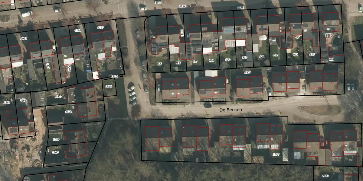 Het perceel waarop De Beuken 3 staat heeft een oppervlakte van 1823 m². Dit is een zeer groot perceel. De perceeloppervlakte wordt geregistreerd door het Kadaster. Gedetailleerde informatie over de maten van dit perceel kunt u vinden in het rapport Kadastrale kaart met maatvoering van De Beuken 3.
