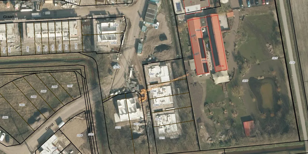 Het perceel waarop Gerst 2 staat heeft een oppervlakte van 366 m². Dit is een groot perceel. De perceeloppervlakte wordt geregistreerd door het Kadaster. Gedetailleerde informatie over de maten van dit perceel kunt u vinden in het rapport Kadastrale kaart met maatvoering van Gerst 2.