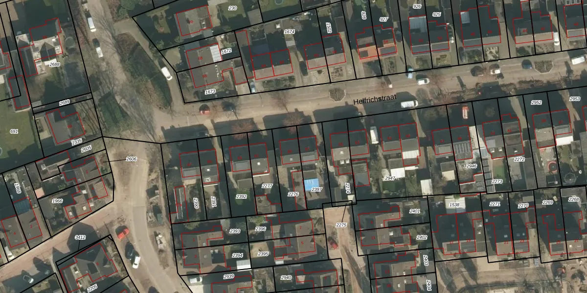 Het perceel waarop Helfrichstraat 59 staat heeft een oppervlakte van 249 m². Dit is een middelgroot perceel. De perceeloppervlakte wordt geregistreerd door het Kadaster. Gedetailleerde informatie over de maten van dit perceel kunt u vinden in het rapport Kadastrale kaart met maatvoering van Helfrichstraat 59.