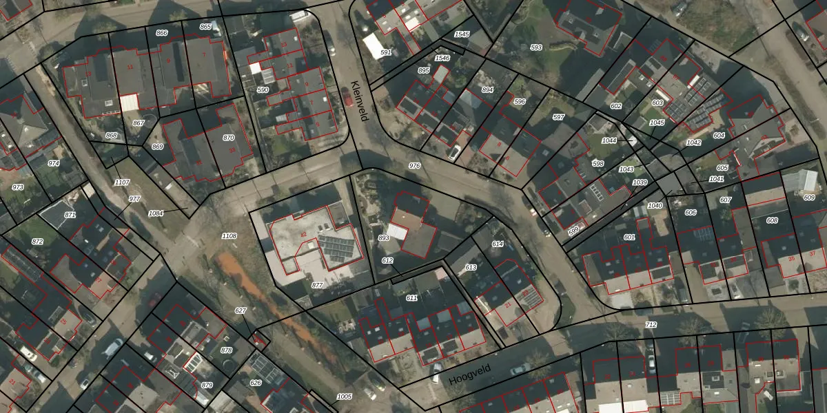 Het perceel waarop Kleinveld 1 staat heeft een oppervlakte van 556 m². Dit is een groot perceel. De perceeloppervlakte wordt geregistreerd door het Kadaster. Gedetailleerde informatie over de maten van dit perceel kunt u vinden in het rapport Kadastrale kaart met maatvoering van Kleinveld 1.