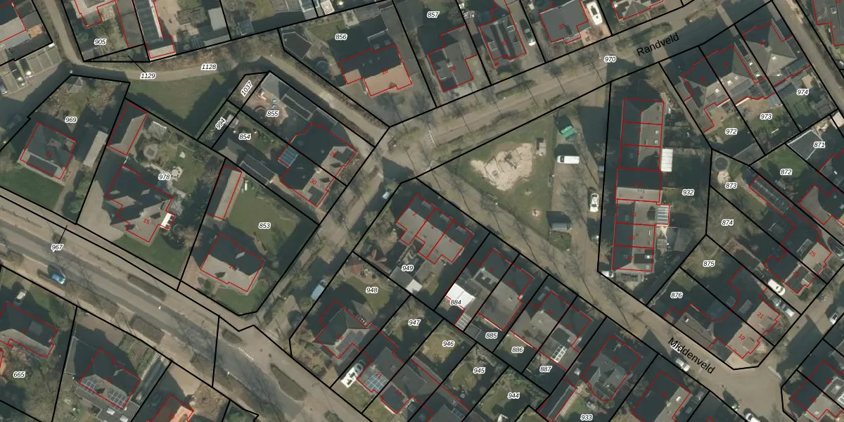 Het perceel waarop Middenveld 2 staat heeft een oppervlakte van 546 m². Dit is een groot perceel. De perceeloppervlakte wordt geregistreerd door het Kadaster. Gedetailleerde informatie over de maten van dit perceel kunt u vinden in het rapport Kadastrale kaart met maatvoering van Middenveld 2.