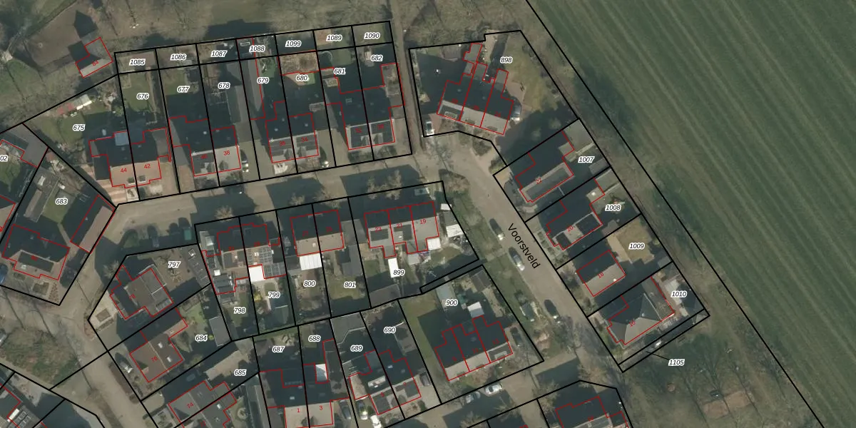 Het perceel waarop Voorstveld 19 staat heeft een oppervlakte van 576 m². Dit is een groot perceel. De perceeloppervlakte wordt geregistreerd door het Kadaster. Gedetailleerde informatie over de maten van dit perceel kunt u vinden in het rapport Kadastrale kaart met maatvoering van Voorstveld 19.